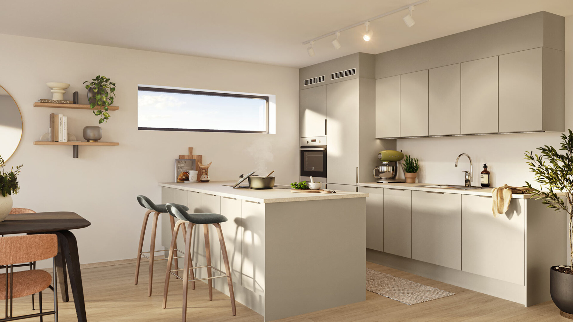 Boligen får et lekkert kvalitetskjøkken fra Sigdal med integrerte hvitevarer som platetopp, ovn, oppvaskmaskin og kjøleskap med frys. Kjøkkenet har et stilrent design fra serien Uno i frontfargen frø. Det er mulig å velge kostnadsfritt mellom 15 forskjellige frontfarger. Benkeplaten kommer i slitesterkt laminat i typen 652 delaware stone, der du også kan velge kostnadsfritt blant de øvrige laminatene hos Sigdal.