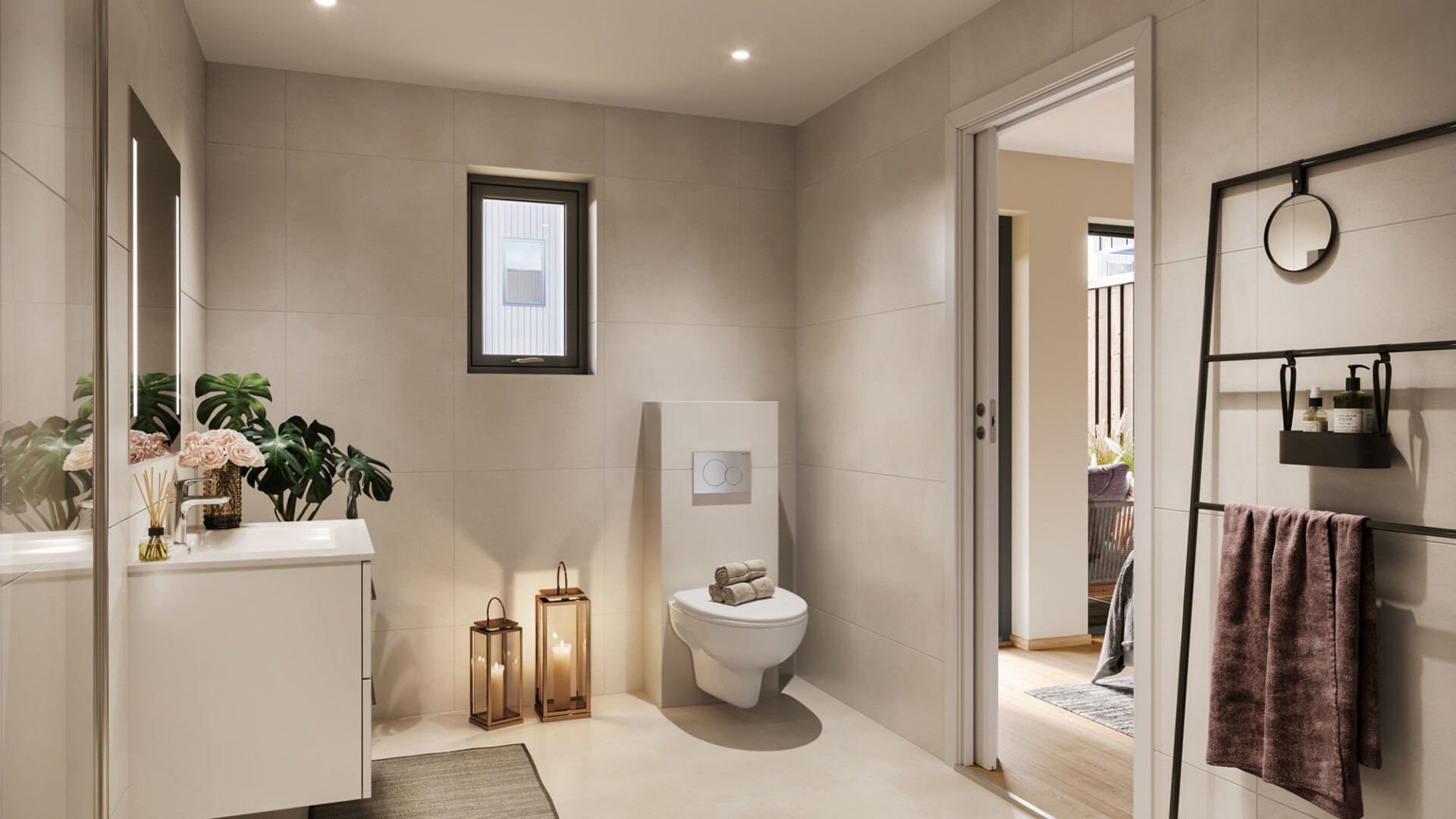 Begge badene kommer med gulvvarme, vegghengt toalett og dusj med innfellbare glassvegger. I tillegg en matt, hvit baderomsservant med skuffer, og et overspeil med integrert lys. Ett av badene har plass til badekar som tilvalg. Badene innredes med store 60 x 60 cm fliser i en delikat sandfarget tone. Downlights gir en behagelig belysning. Vaskerommet har flislagt gulv med varme, og opplegg for både vaskemaskin og tørketrommel. Det kan gjøres endringer på baderomsinnredning og fliser innenfor leverandørenes sortiment.